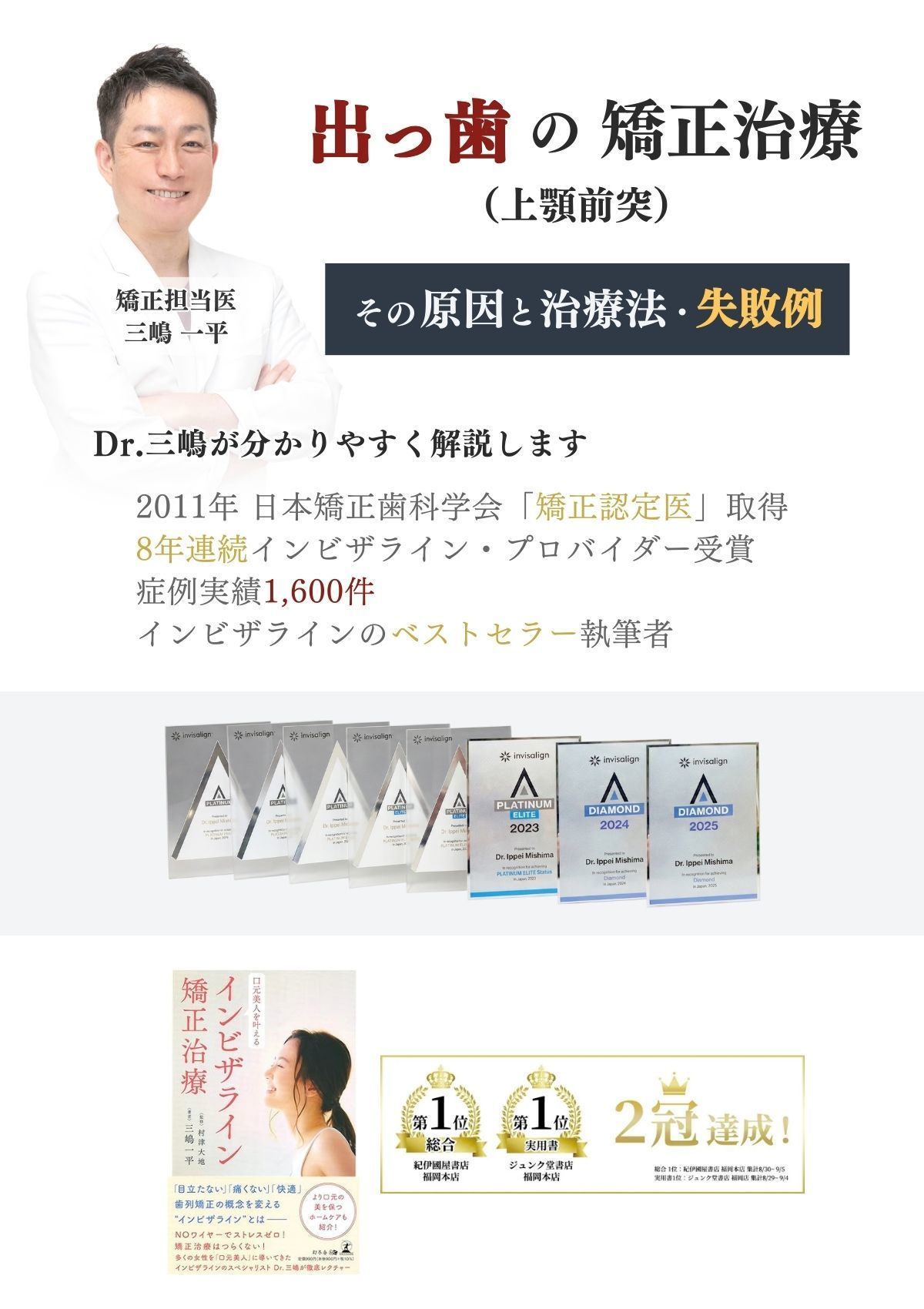 私が手がけた矯正治療の実績は累計で1,600症例にのぼり、インビザライン社から最高クラスの「ダイヤモンドプロバイダー」に認定されております。