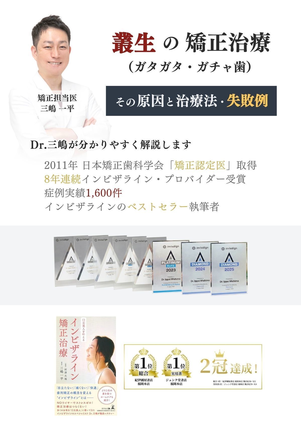 私が手がけた矯正治療の実績は累計で1,600症例にのぼり、インビザライン社から最高クラスの「ダイヤモンドプロバイダー」に認定されております。