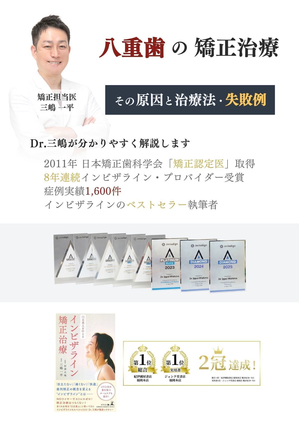 私が手がけた矯正治療の実績は累計で1,600症例にのぼり、インビザライン社から最高クラスの「ダイヤモンドプロバイダー」に認定されております。